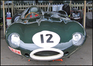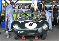 | Friday is the official practice day and the least crowded in the Paddock. Here you can see the 'D'-types including the famous 774 RW Le Mans car. This 1955 'long nose' 'D'-type driven by Anthony Reid in the Sussex Trophy has been driven by such notables as Mike Hawthorn, Win Percy and Ivor Bueb. The green 1954 'D'-type bottom right, was driven by owner Lukas Huni in the same race. Top right is the beautiful 1952 Allard J2X owned and driven by Alan Patterson. A third 'D' -type is being pushed into position. A truly amazing collection of classic cars |